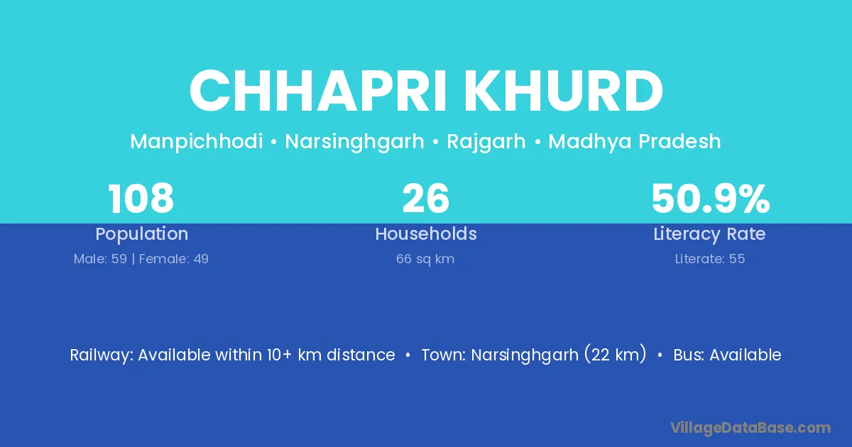 Chhapri Khurd village has a total population of 2,118 people, of which 1,068 are males and 1,050 are females.