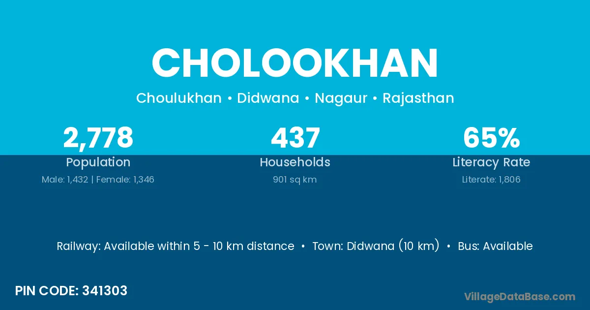Didwana (10 km) is the nearest town to Cholookhan village for major economic activities and is located approximately 10 km away.