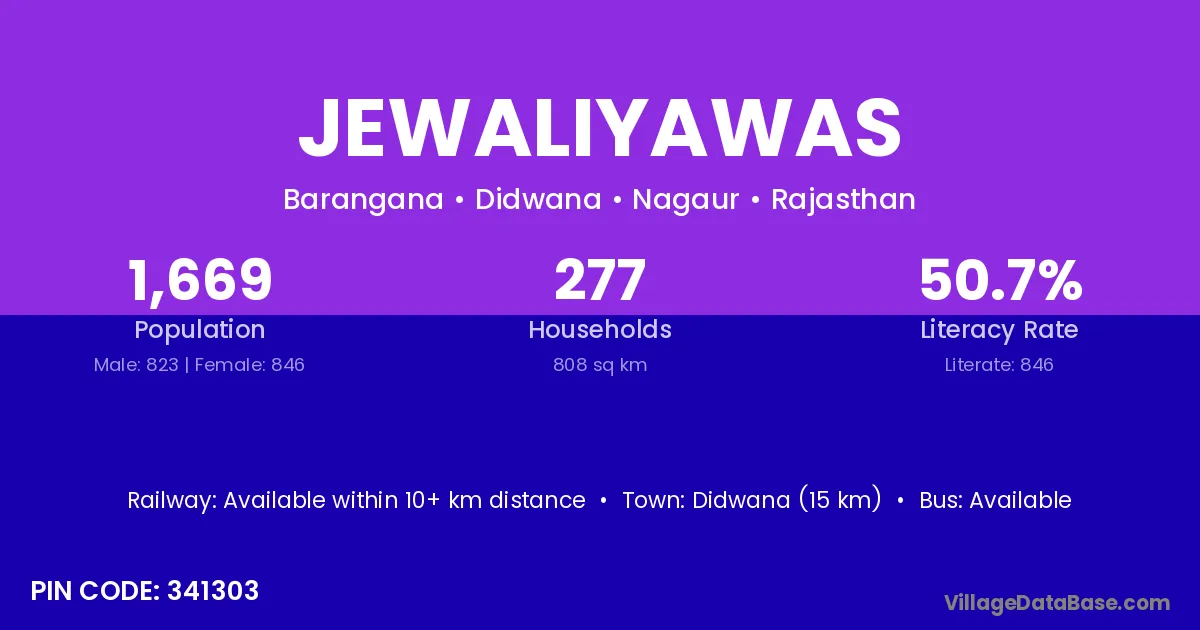 Didwana (15 km) is the nearest town to Jewaliyawas village for major economic activities and is located approximately 15 km away.