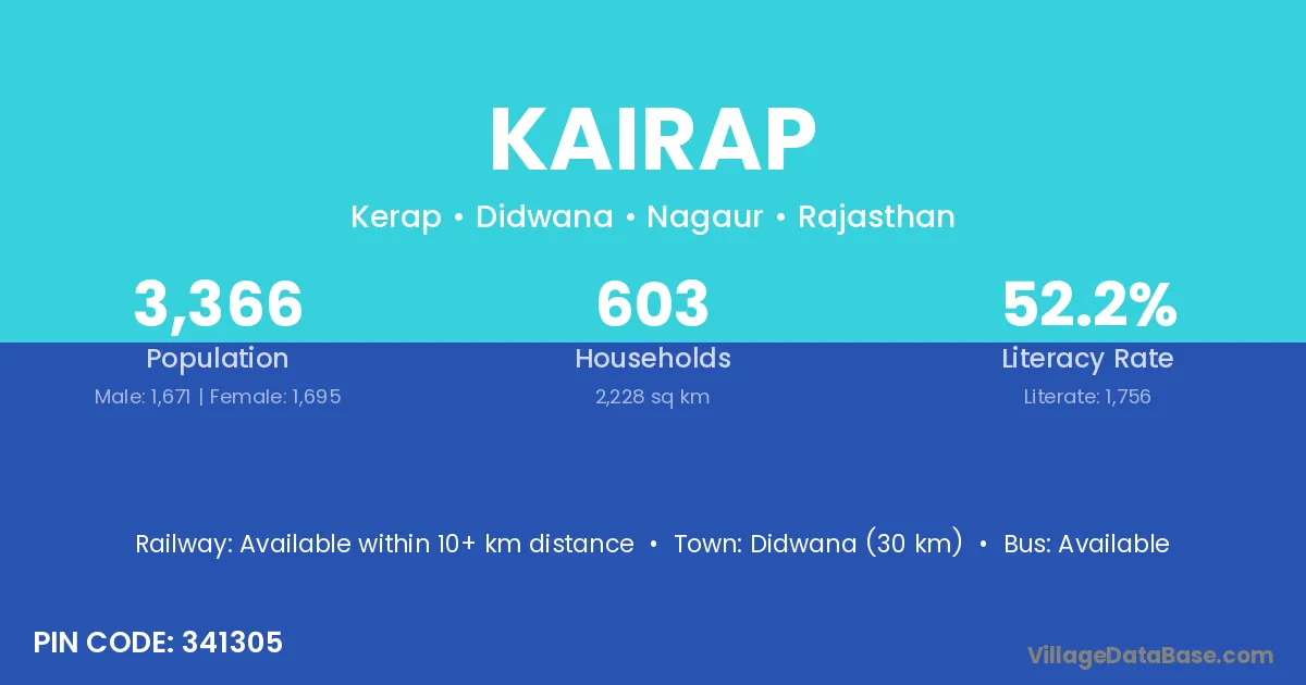 Didwana (30 km) is the nearest town to Kairap village for major economic activities and is located approximately 30 km away.