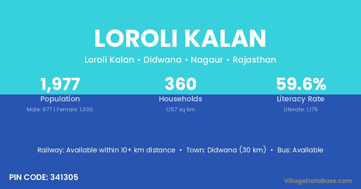 Didwana (30 km) is the nearest town to Loroli Kalan village for major economic activities and is located approximately 30 km away.