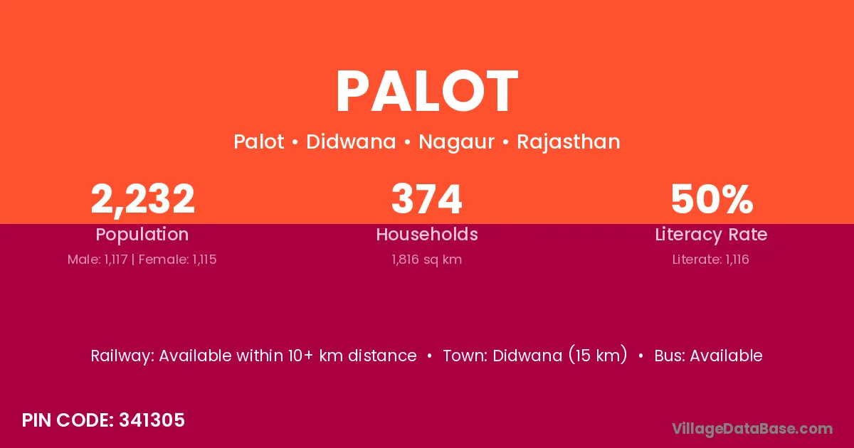 Didwana (15 km) is the nearest town to Palot village for major economic activities and is located approximately 15 km away.