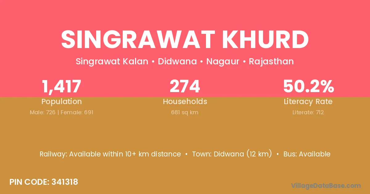 Didwana (12 km) is the nearest town to Singrawat Khurd village for major economic activities and is located approximately 12 km away.