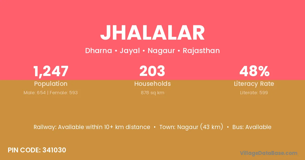 Nagaur (43 km) is the nearest town to Jhalalar village for major economic activities and is located approximately 43 km away.