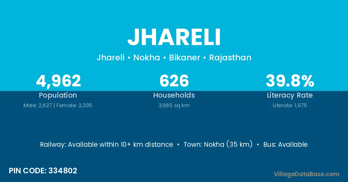 Nagaur (36 km) is the nearest town to Jhareli village for major economic activities and is located approximately 36 km away.