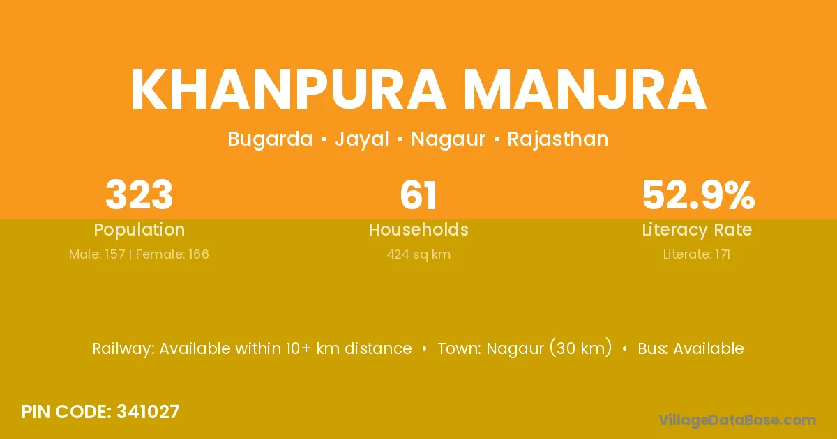 Nagaur (30 km) is the nearest town to Khanpura Manjra village for major economic activities and is located approximately 30 km away.