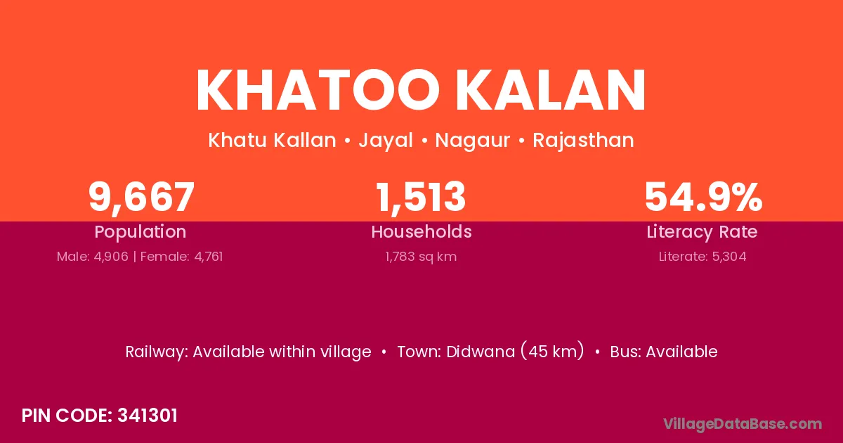 Didwana (45 km) is the nearest town to Khatoo Kalan village for major economic activities and is located approximately 45 km away.
