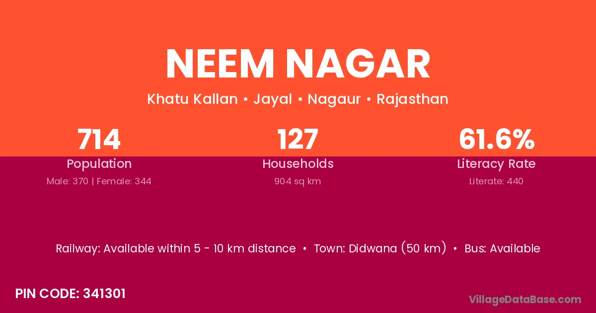 Didwana (50 km) is the nearest town to Neem Nagar village for major economic activities and is located approximately 50 km away.