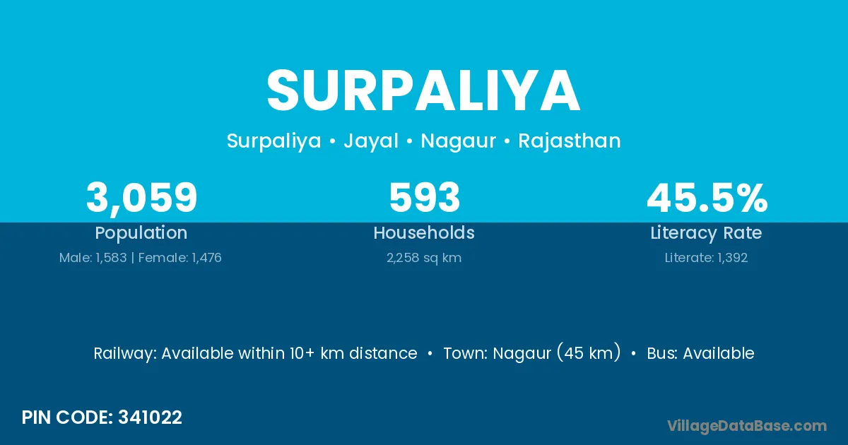 Nagaur (45 km) is the nearest town to Surpaliya village for major economic activities and is located approximately 45 km away.