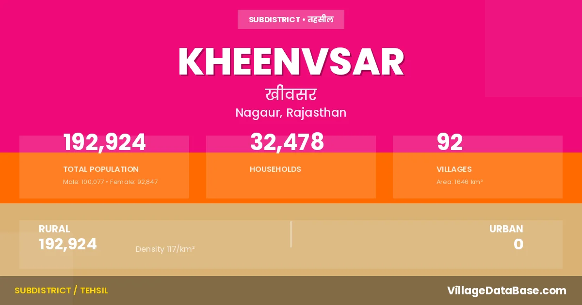 According to the 2011 census The total area of Kheenvsar Tehsil is 1646 km², with a population of 192924 people. The population density is 117 inhabitants per square kilometre, and there are approximately 32478 houses in the sub district.