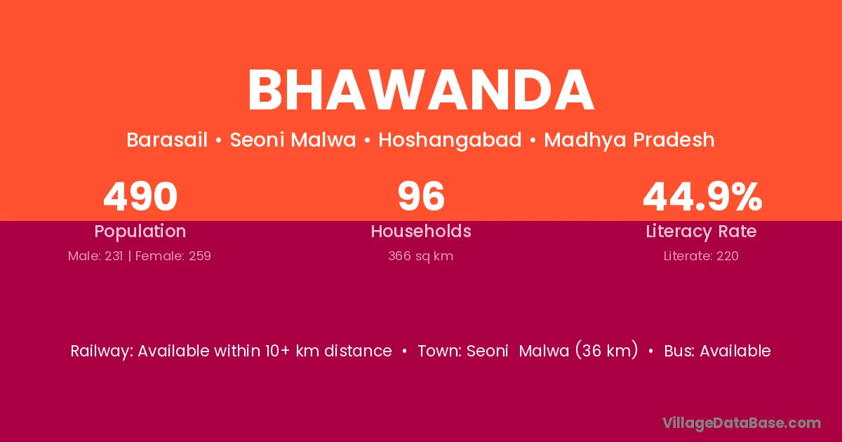 The literacy rate of Bhawanda village is 47.35%. Male literacy stands at 60.60% and female literacy at 32.44%.