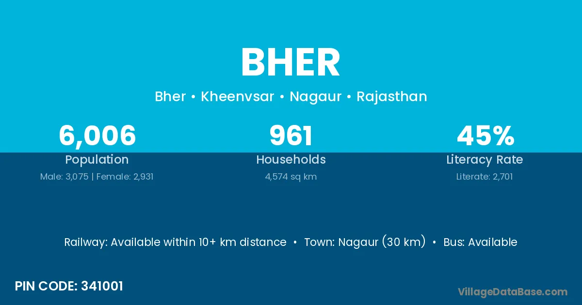 Nagaur (30 km) is the nearest town to Bher village for major economic activities and is located approximately 30 km away.