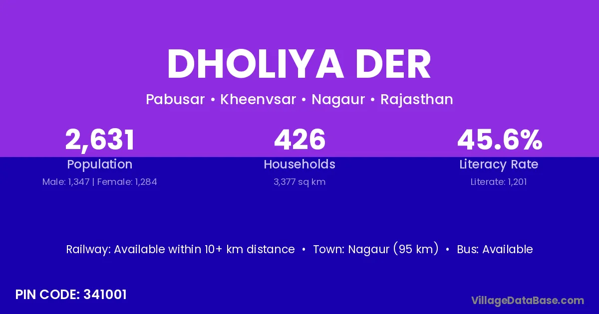 Nagaur (95 km) is the nearest town to Dholiya Der village for major economic activities and is located approximately 95 km away.
