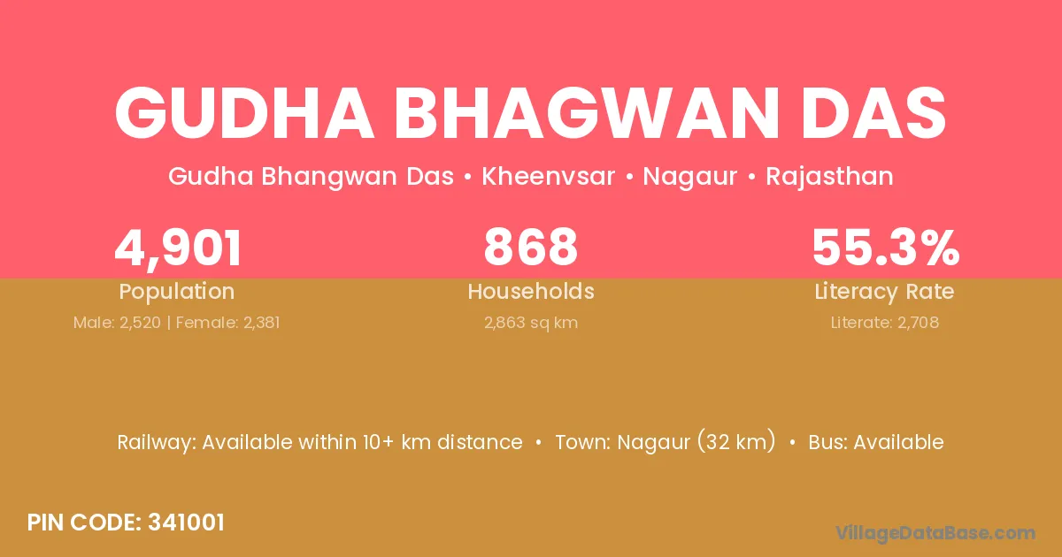 Nagaur (32 km) is the nearest town to Gudha Bhagwan Das village for major economic activities and is located approximately 32 km away.