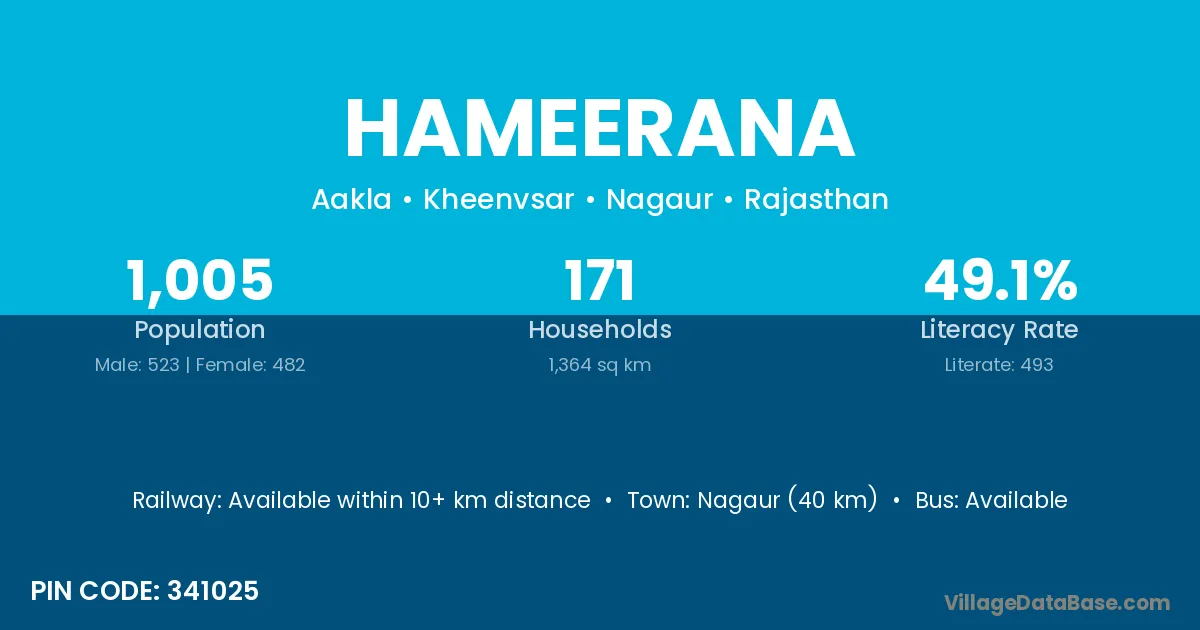 Nagaur (40 km) is the nearest town to Hameerana village for major economic activities and is located approximately 40 km away.