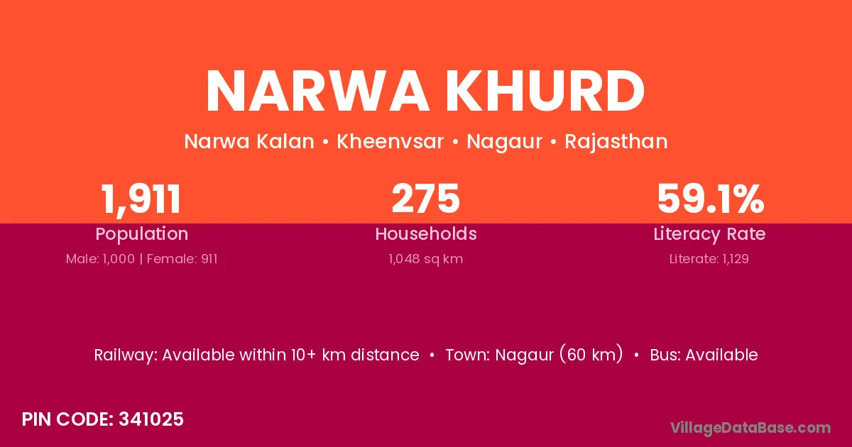 Nagaur (60 km) is the nearest town to Narwa Khurd village for major economic activities and is located approximately 60 km away.