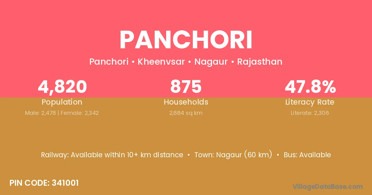 Nagaur (60 km) is the nearest town to Panchori village for major economic activities and is located approximately 60 km away.