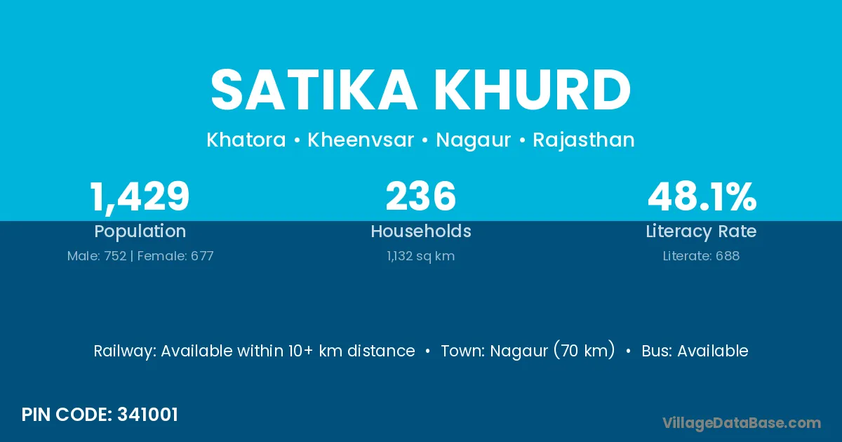 Nagaur (70 km) is the nearest town to Satika Khurd village for major economic activities and is located approximately 70 km away.