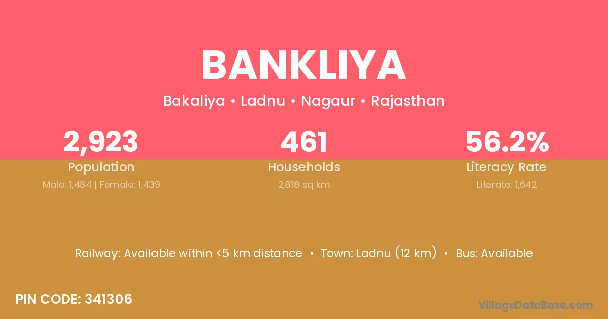 Ladnu (12 km) is the nearest town to Bankliya village for major economic activities and is located approximately 12 km away.