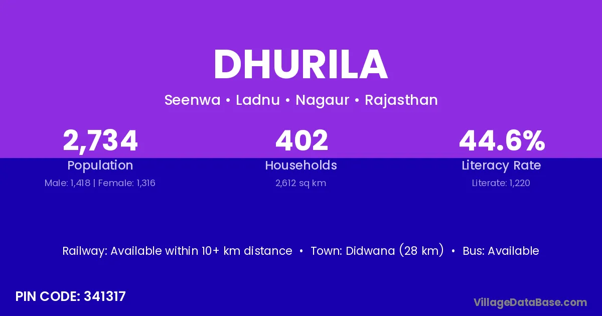Didwana (28 km) is the nearest town to Dhurila village for major economic activities and is located approximately 28 km away.