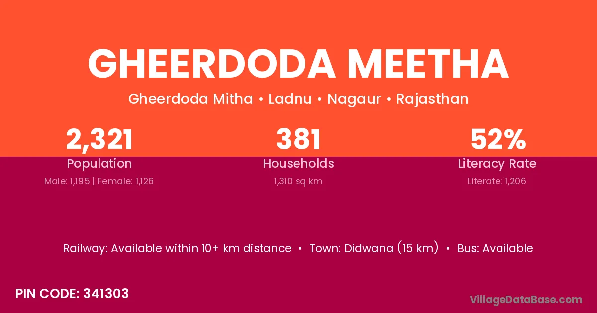 Didwana (15 km) is the nearest town to Gheerdoda Meetha village for major economic activities and is located approximately 15 km away.