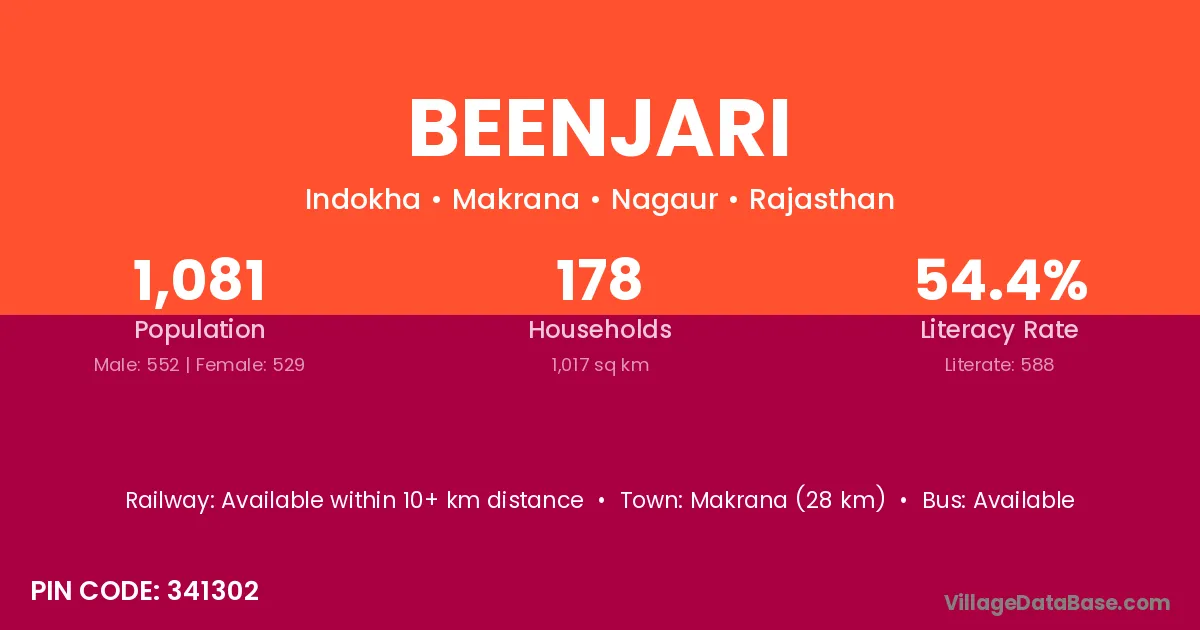 Makrana (28 km) is the nearest town to Beenjari village for major economic activities and is located approximately 28 km away.