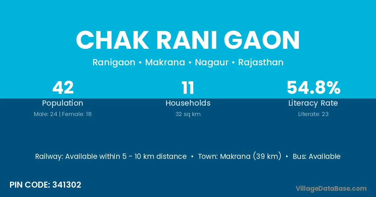 Makrana (39 km) is the nearest town to Chak Rani Gaon village for major economic activities and is located approximately 39 km away.