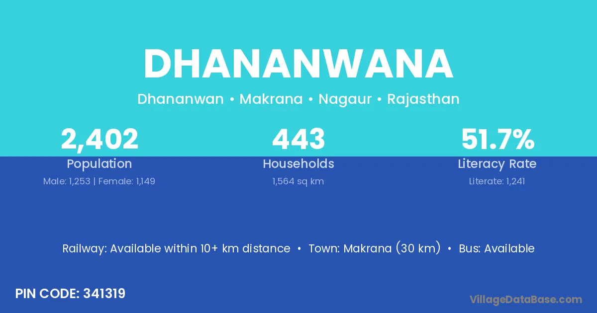 Makrana (30 km) is the nearest town to Dhananwana village for major economic activities and is located approximately 30 km away.
