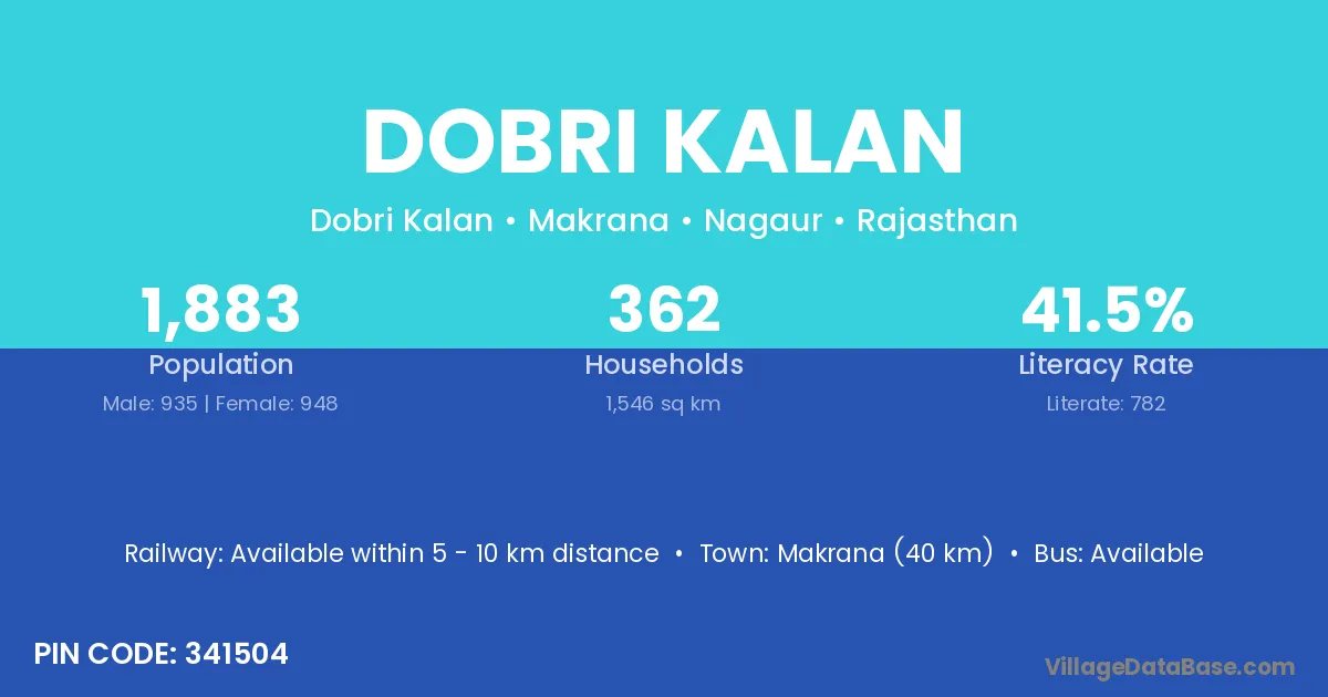 Makrana (40 km) is the nearest town to Dobri Kalan village for major economic activities and is located approximately 40 km away.