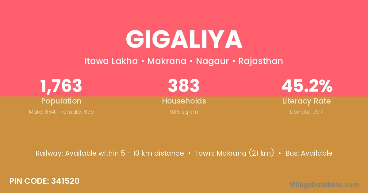Makrana (21 km) is the nearest town to Gigaliya village for major economic activities and is located approximately 21 km away.