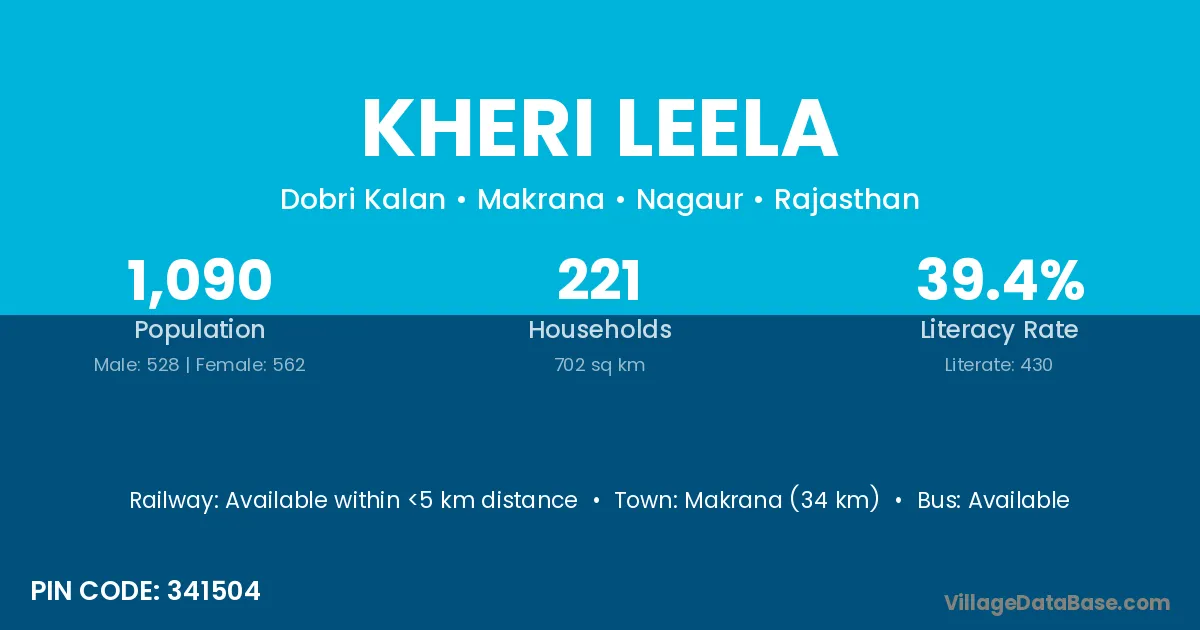 Makrana (34 km) is the nearest town to Kheri Leela village for major economic activities and is located approximately 34 km away.