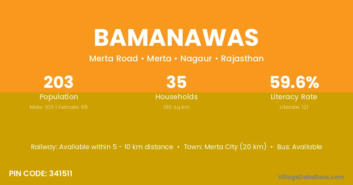 Merta City (20 km) is the nearest town to Bamanawas village for major economic activities and is located approximately 20 km away.