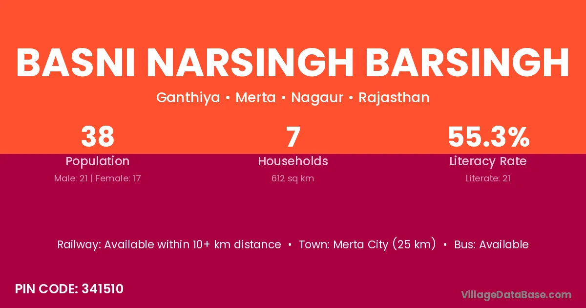 Merta City (25 km) is the nearest town to Basni Narsingh Barsingh village for major economic activities and is located approximately 25 km away.