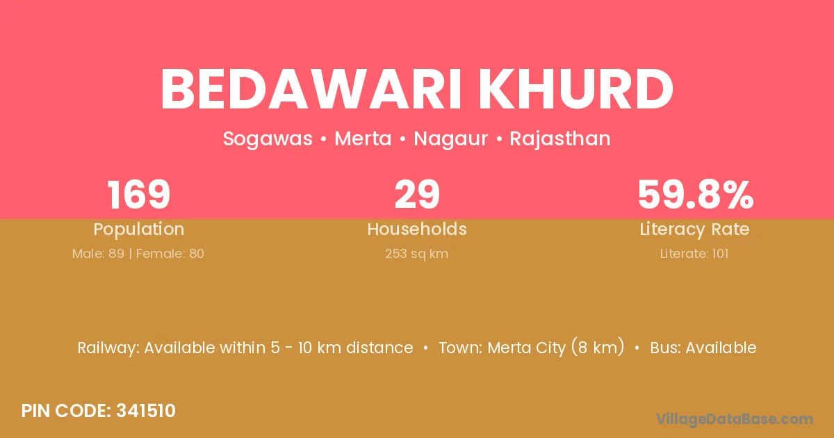 Merta City (8 km) is the nearest town to Bedawari Khurd village for major economic activities and is located approximately 8 km away.