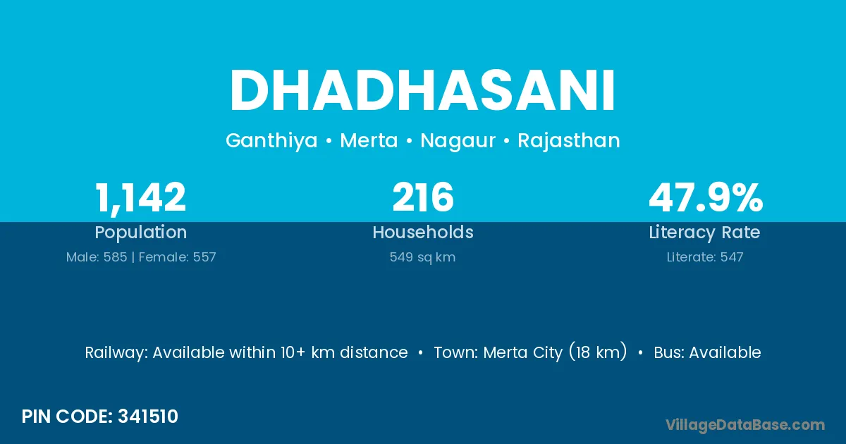 Merta City (18 km) is the nearest town to Dhadhasani village for major economic activities and is located approximately 18 km away.