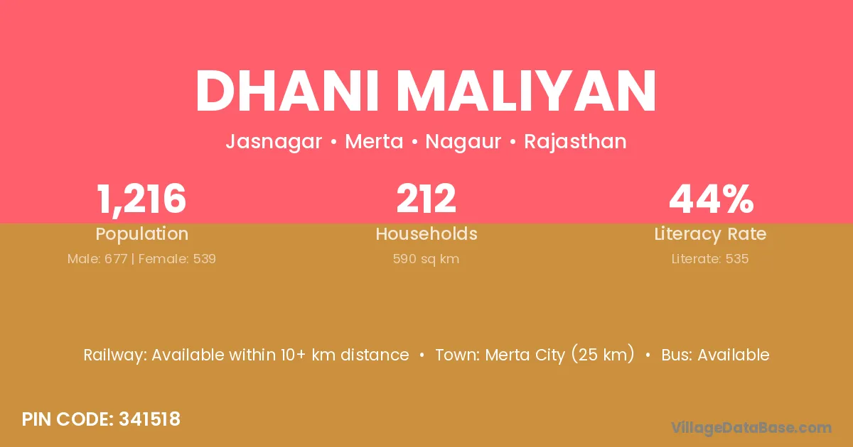 Merta City (25 km) is the nearest town to Dhani Maliyan village for major economic activities and is located approximately 25 km away.