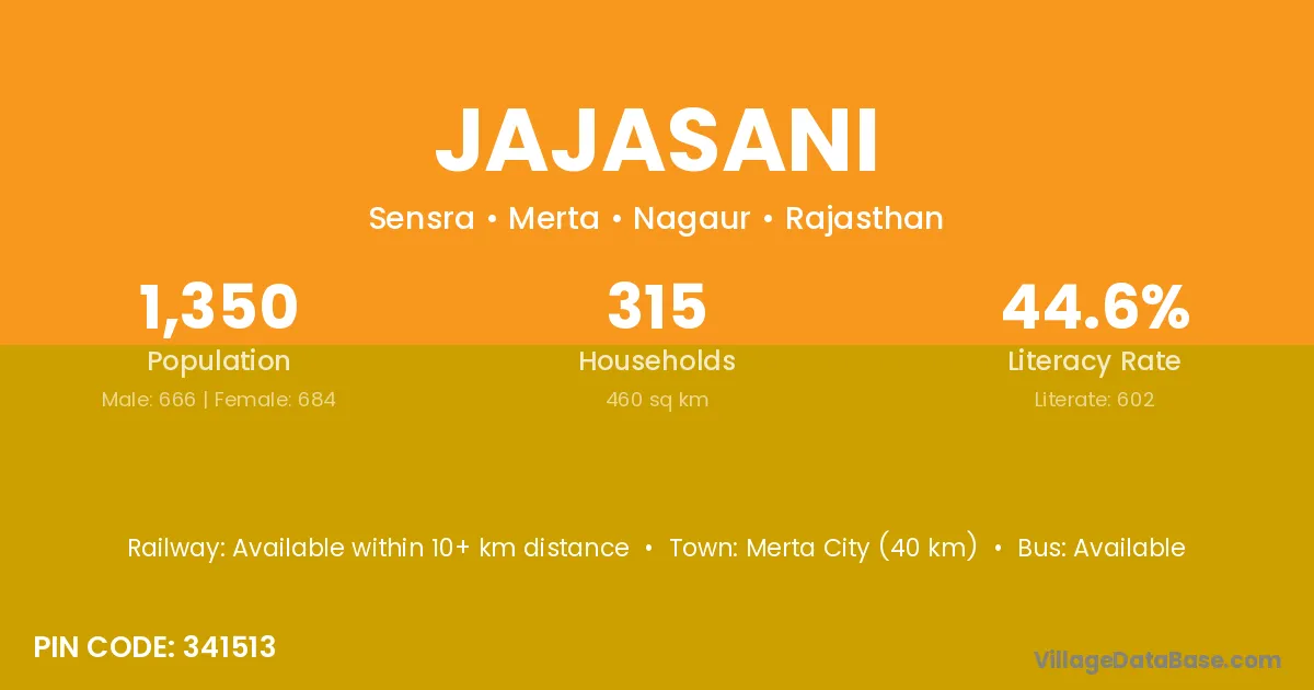 Merta City (40 km) is the nearest town to Jajasani village for major economic activities and is located approximately 40 km away.