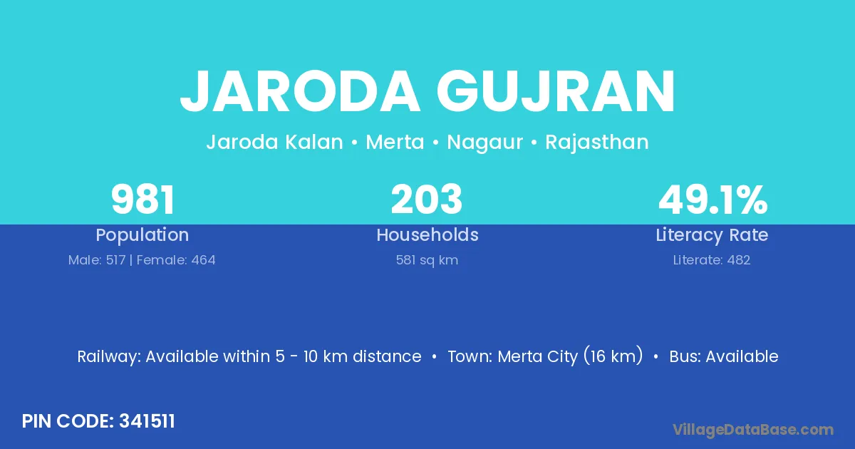 Merta City (16 km) is the nearest town to Jaroda Gujran village for major economic activities and is located approximately 16 km away.