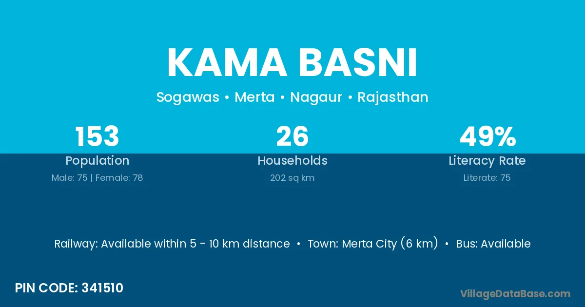 Merta City (6 km) is the nearest town to Kama Basni village for major economic activities and is located approximately 6 km away.