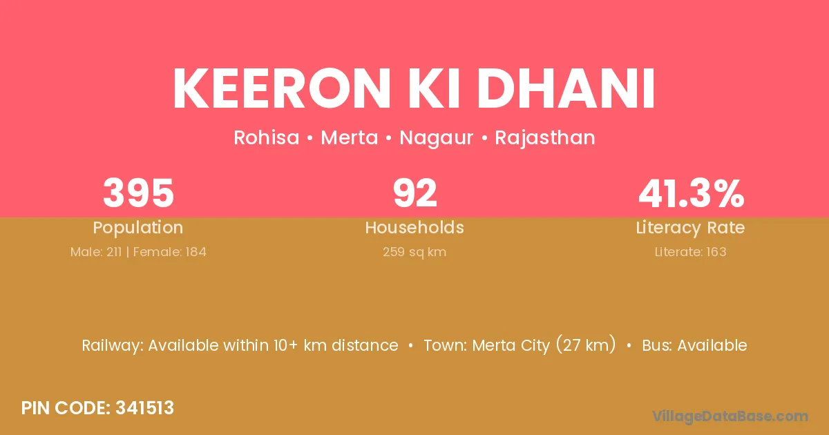 Keeron Ki Dhani village has a total population of 395 people, of which 211 are males and 184 are females.
