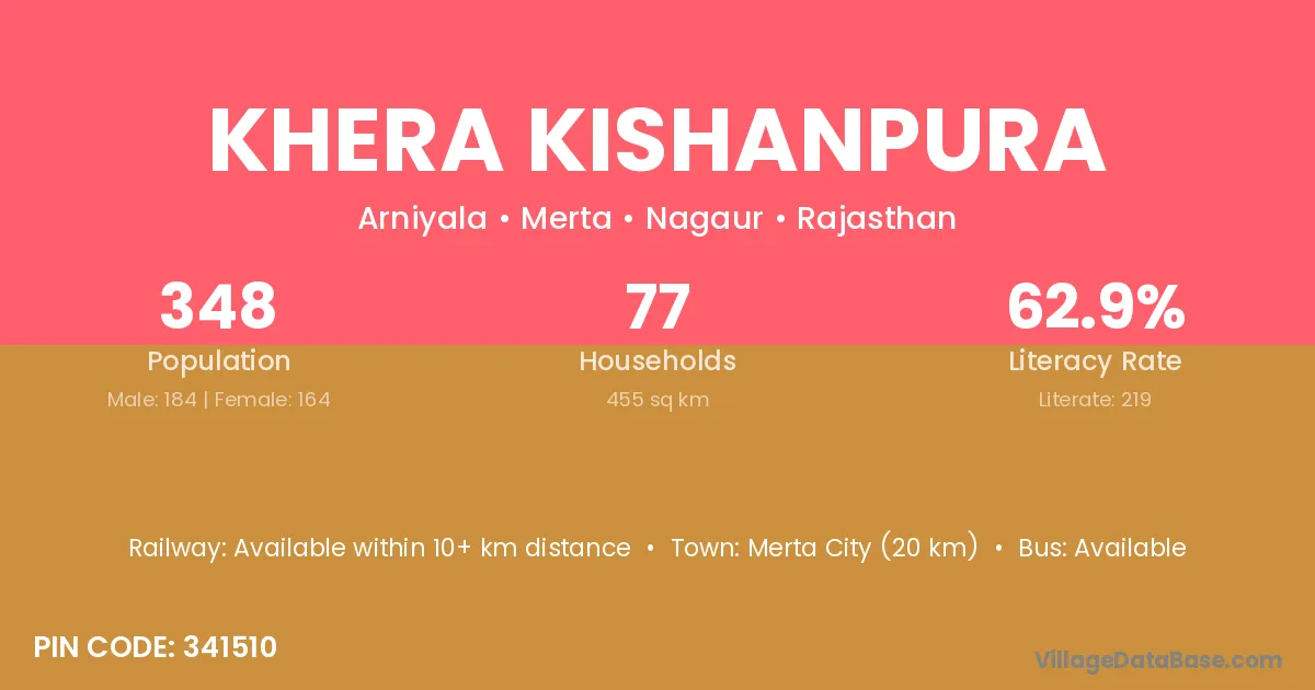 Merta City (20 km) is the nearest town to Khera Kishanpura village for major economic activities and is located approximately 20 km away.