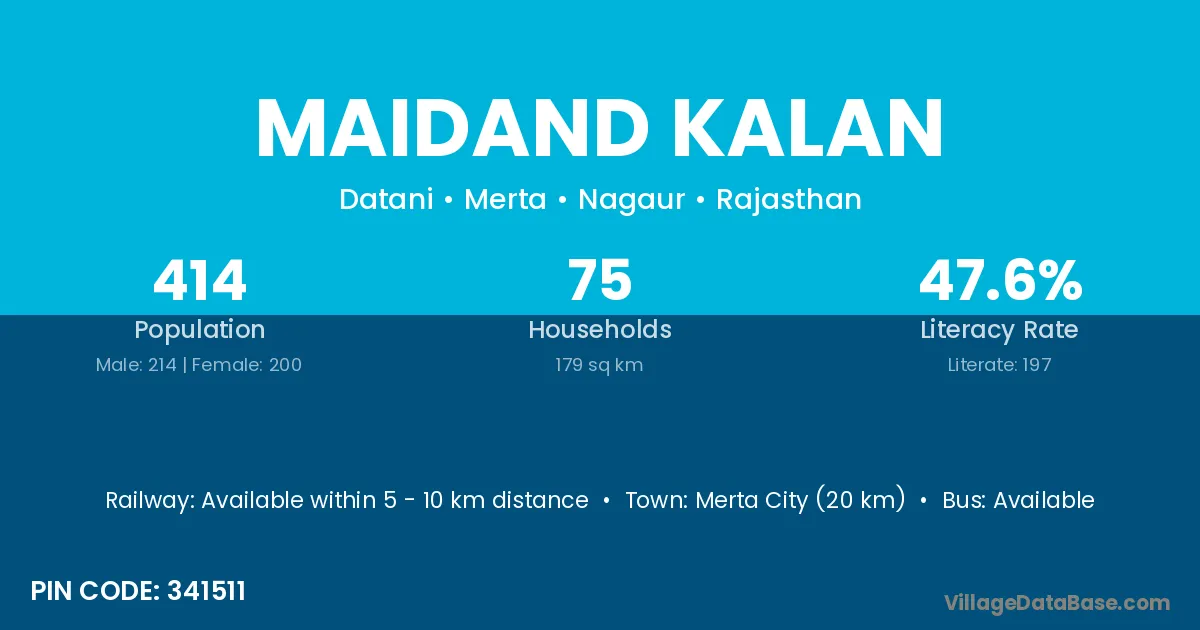 Merta City (20 km) is the nearest town to Maidand Kalan village for major economic activities and is located approximately 20 km away.