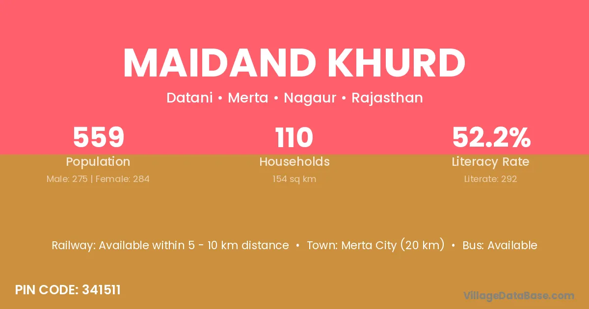Merta City (20 km) is the nearest town to Maidand Khurd village for major economic activities and is located approximately 20 km away.