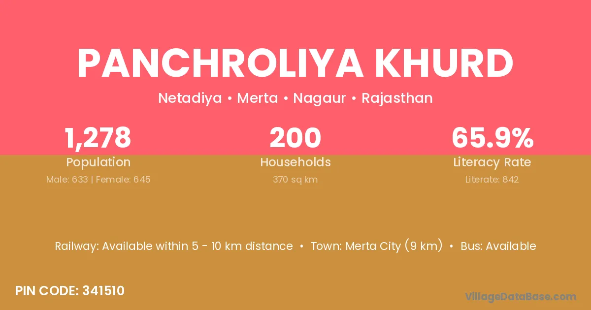 Merta City (9 km) is the nearest town to Panchroliya Khurd village for major economic activities and is located approximately 9 km away.