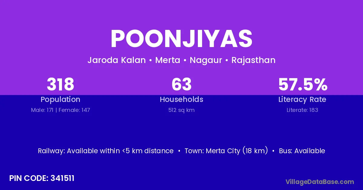 Merta City (18 km) is the nearest town to Poonjiyas village for major economic activities and is located approximately 18 km away.