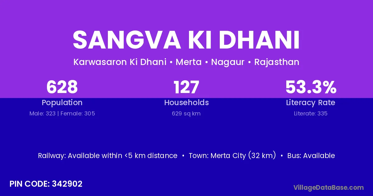 Sangva Ki Dhani village has a total population of 628 people, of which 323 are males and 305 are females.