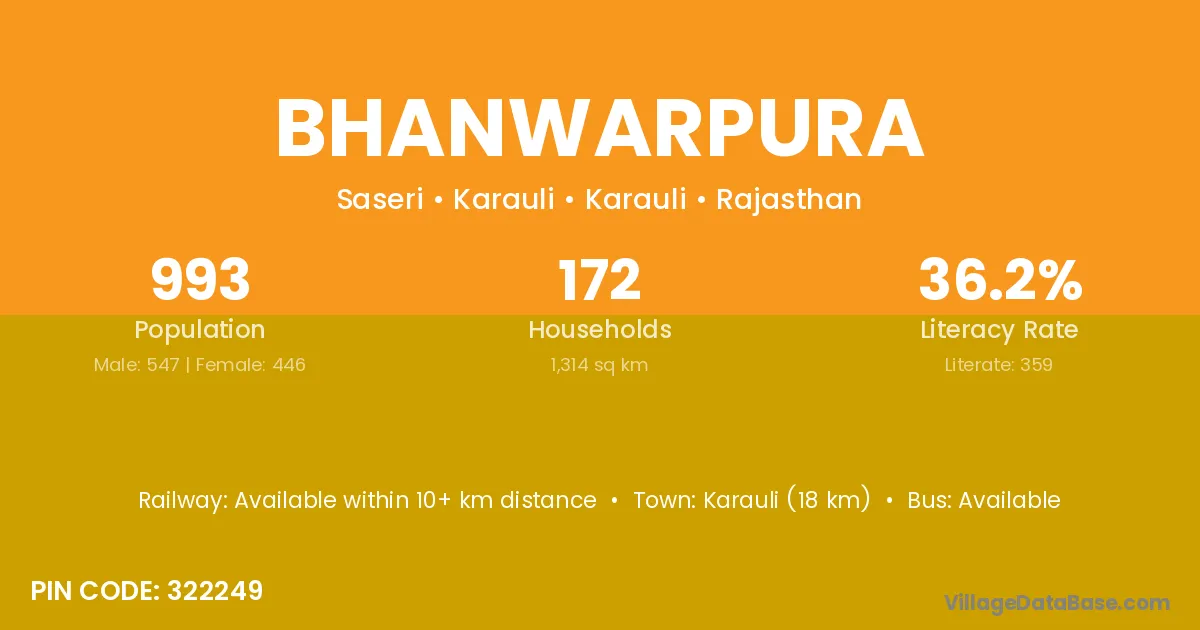 The literacy rate of Bhanwarpura village is 46.00%. Male literacy stands at 57.96% and female literacy at 33.69%.