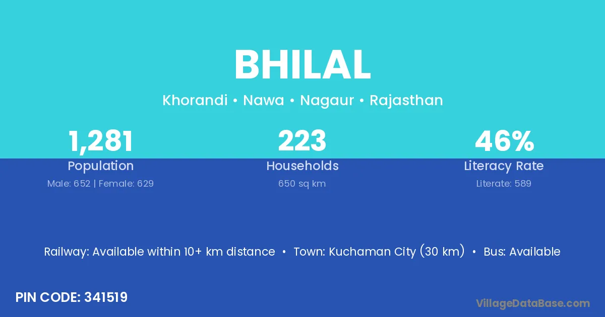 Kuchaman City (30 km) is the nearest town to Bhilal village for major economic activities and is located approximately 30 km away.