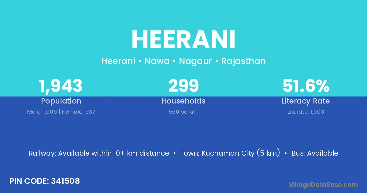 Kuchaman City (5 km) is the nearest town to Heerani village for major economic activities and is located approximately 5 km away.