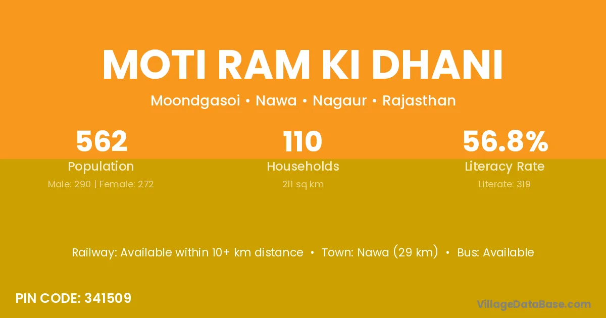 Moti Ram Ki Dhani village has a total population of 562 people, of which 290 are males and 272 are females.